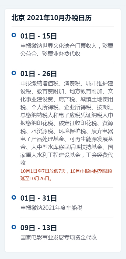 对于企业来说,尤其是刚成立的公司,税务局会根据企业经营范围核定税种和税目,一旦在系统核定完成,企业就应该在规定的申报期间按时齐全的申报,错过申报期和漏申报都会被罚款。如果不及时申报,公司无法在网上正常清卡,只能带着资料去办税服务大厅办理了。此外,没有按时纳税申报的纳税人,税务机关通过实地调查、电话查访,查无下落的,或无法联系到的,都可能会判定公司为“走逃(失联)企业”,即老赖,一旦和老赖挂钩,会严重影响公司品牌形象和诚信,为公司经营带来很大的影响。除此之外,还会影响到公司的纳税信用等级。等级过低会被公示,也会影响公司运营。“办税日历”的上线,对公司来说百利无一害。“办税日历”相当于企业的报税闹钟,到什么时间报什么税一目了然,避免了漏报税的风险。为了方便纳税人每月纳税申报,中天鼎业特整理了2021年10月至12月办税日历,请收藏好!